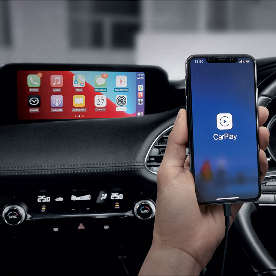 สัมผัสชีวิตอิสระ กับเทคโนโลยีเชื่อมต่อไร้ขีดจำกัดของ New Mazda3 ให้คุณไม่พลาดทุกการติดต่อในทุกเส้นทาง ทั้งโลกโซเชียล และอัปเดตข้อมูลข่าวสารได้ตลอดเวลา ด้วยการเชื่อมต่อแอพพลิเคชั่นบนสมาร์ทโฟน ผ่านระบบ Mazda Connect ที่มาพร้อม Apple CarPlay® และ Android Auto™*