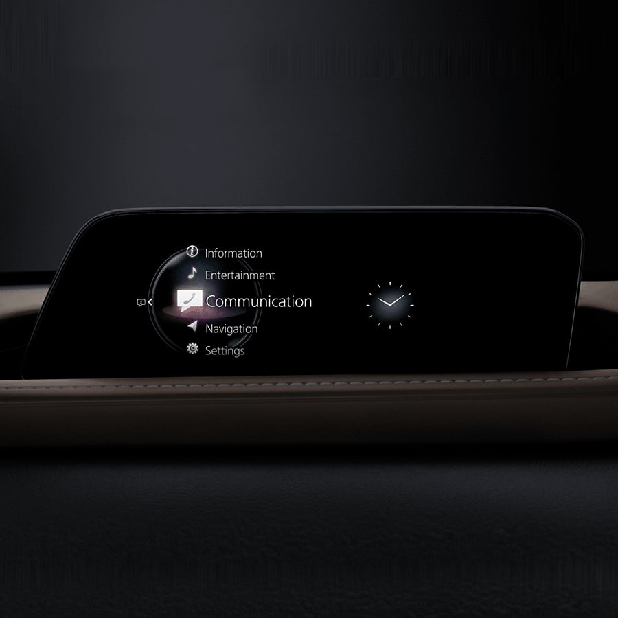หน้าจอสีแบบ Widescreen ขนาด 8.8 นิ้ว แสดงเมนูคำสั่งของ Mazda Connect ตั้งค่าการใช้งานอื่นๆ ออกแบบให้ดูพรีเมี่ยม จัดวางในตำแหน่งศูนย์กลาง เหนือแผงอุปกรณ์หน้ารถ ในองศาที่ผู้ขับขี่มองเห็นได้สะดวกขึ้น