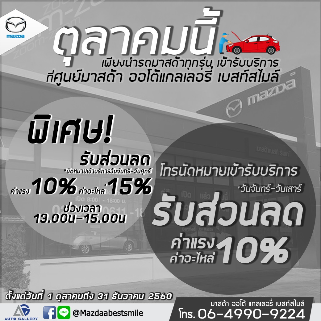 มาสด้า ออโต้ แกลเลอรี่ เบสท์สไมล์ เอาใจคุณลูกค้าทุกท่าน มอบสิทธิพิเศษให้กับลูกค้า เพียงทำการโทรนัดหมายกับเรา และนำรถยนต์มาสด้ารุ่นใดก็ได้เข้าใช้บริการ ณ ศูนย์บริการ มาสด้า ออโต้ แกลเลอรี่ เบสท์สไมล์ ก็มีสิทธิได้รับส่วนลดค่าแรง และค่าอะไหล่ มากมาย โดยเป็นตามเงือนไขบริษัทฯ ดังนี้